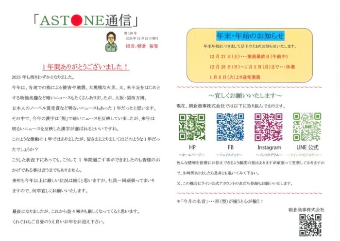 ASTONEからこんにちはASTONE通信 ASTONE通信 第188号 発行しました(^^♪ 2025年12月22日 コメントを残す コメントをキャンセル入力エリアすべてが必須項目です。メールアドレスが公開されることはありません。内容をご確認の上、送信してください。